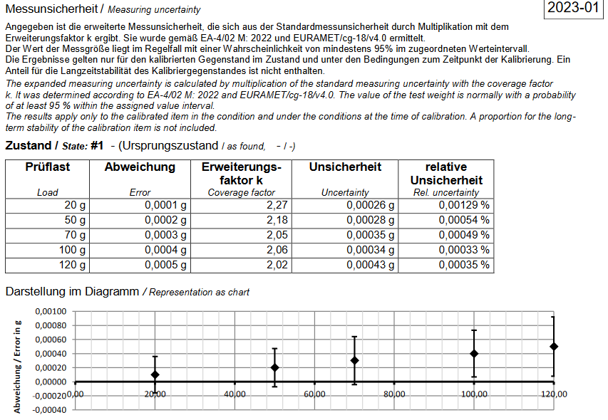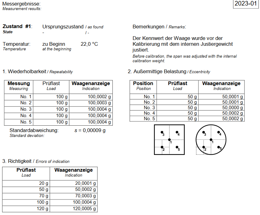 Sollten aufgrund einer Justage oder Reparatur mehrere Kalibrierungen ("as found" / "as left") an der Waage durchgeführt worden sein, so enthält der Kalibrierschein für jeden dieser Zustände einen separaten Abschnitt mit den dazugehörigen Messwerten und -ergebnissen.
