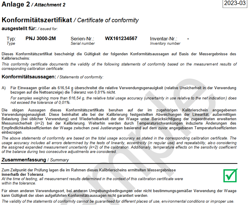 Der Kalibriergegenstand sowie Typ bzw. Modell mit Seriennummer wird dokumentiert. So ist eine Verwechslung unmöglich und die Zuordnung des DAkkS-Kalibrierscheins zu einer expliziten Waage ist gewährleistet.
