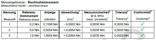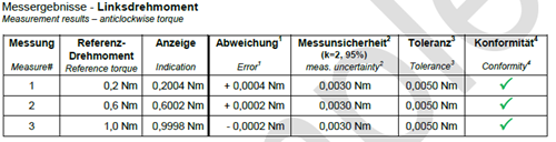 Anbei sehen Sie beispielhaft einen Ausschnitt der Wertaufnahme, den kompletten Musterkalibrierschein können Sie hier ansehen.