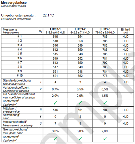 Anbei sehen Sie beispielhaft einen Ausschnitt der Wertaufnahme, den kompletten Musterkalibrierschein können Sie hier ansehen.